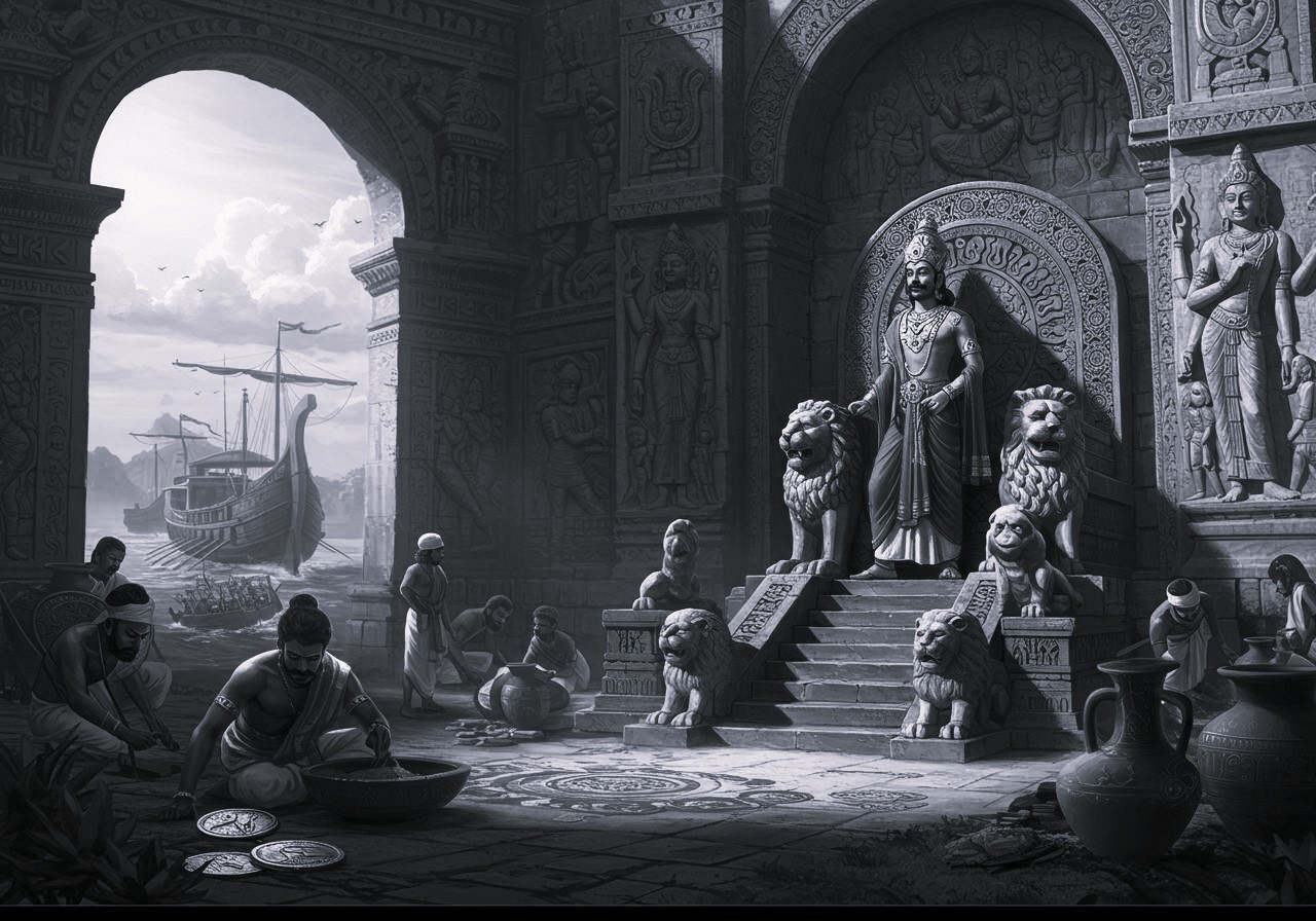 The Satavahana Empire ruled large parts of southern India from around the 2nd century BCE to the 2nd century CE—nearly 450 years. Founded by Srimukha, the dynasty reached its peak under rulers such as Gautamiputra Satakarni, regarded as its most powerful king, while Hala enriched literature with works such as Gathasaptashati. Kondapur reached its zenith between the 1st century BCE and the 2nd century CE as a major trade and industrial centre, particularly for coin minting. Gautamiputra Satakarni, the 23rd Satavahana ruler, restored the dynasty’s declining prestige by defeating the Shakas and Yavanas, earning the title Kshatriya-darpa-mardana. The Nashik inscription commissioned by his mother Gautami Balashri states that his horses drank the waters of three seas (trisamudra-toya-pita-vahana), symbolising his extensive dominion across southern India.