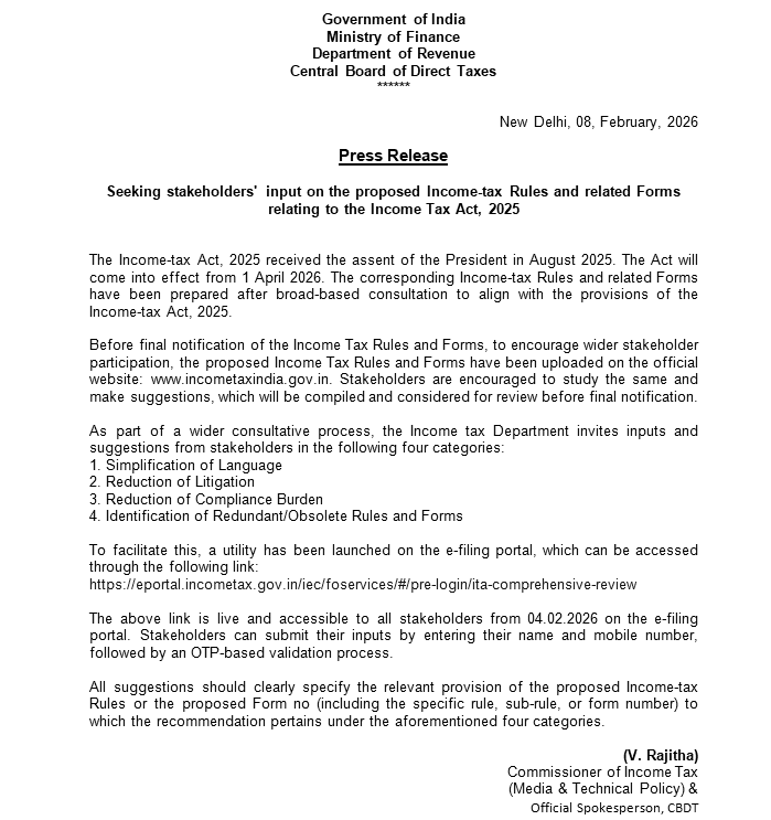 The Income Tax Department on Saturday released draft rules and simplified forms under the Income Tax Act, 2025 , which will replace the six-decade-old Income Tax Act, 1961, from April 1 . The department has invited comments from taxpayers and other stakeholders on the draft Income-tax Rules, 2026 , and forms till February 22 .