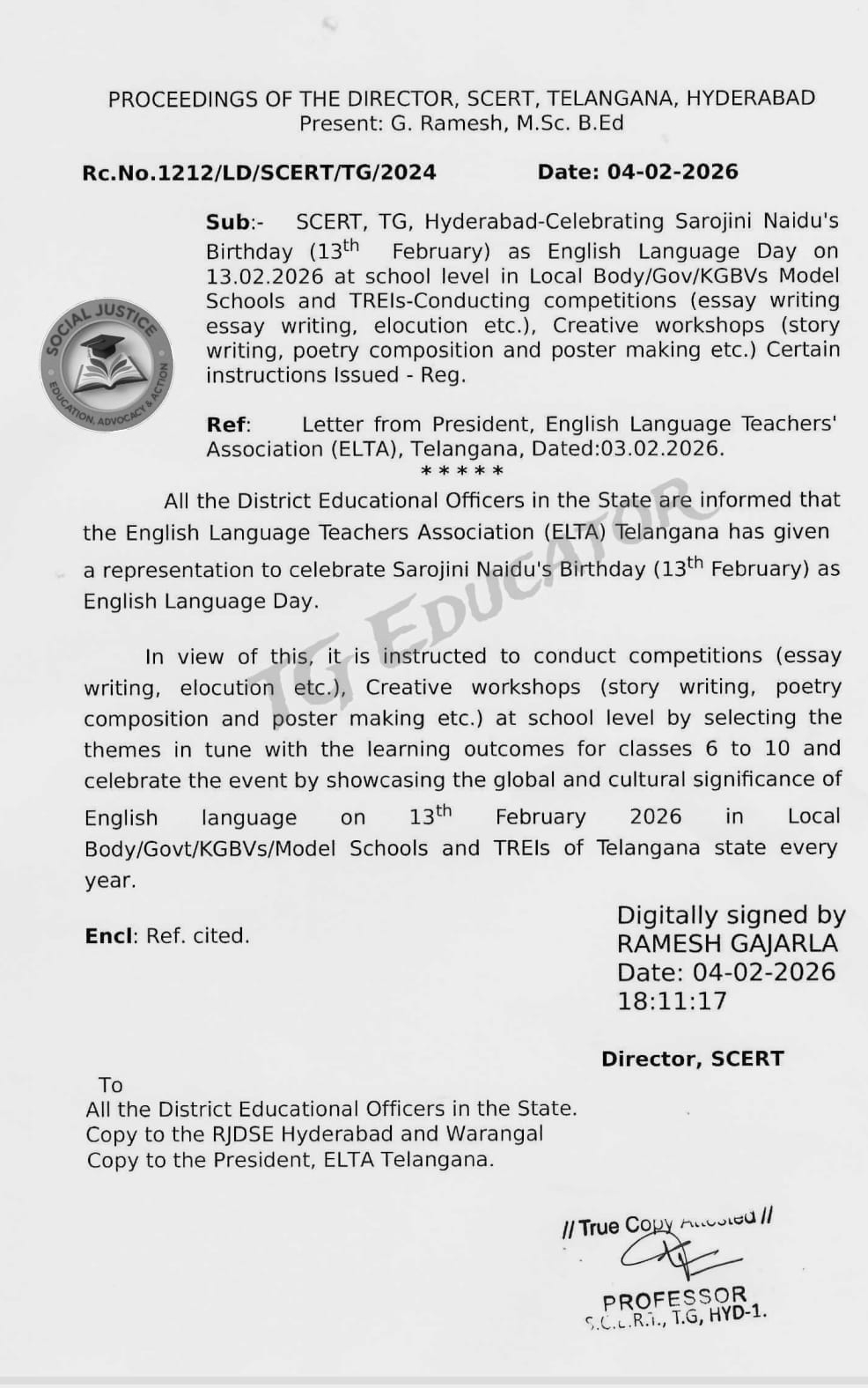 All government schools across Telangana will observe English Language Day on February 13 , following directions issued by the State Council of Educational Research and Training (SCERT), Telangana . The date marks the birth anniversary of Sarojini Naidu , revered as the “Nightingale of India.” SCERT Director G. Ramesh released official orders after considering a representation from the Telangana English Language Teachers’ Association, formalizing the annual observance in her honour. The initiative seeks not only to commemorate a towering literary figure but also to underline the global relevance of the English language and its role in education, communication, and cultural exchange. Education authorities have instructed that the celebrations be conducted meaningfully in all government schools, Zilla Parishad institutions, Kasturba Gandhi Balika Vidyalayas (KGBVs), model schools, and gurukul institutions across the state.