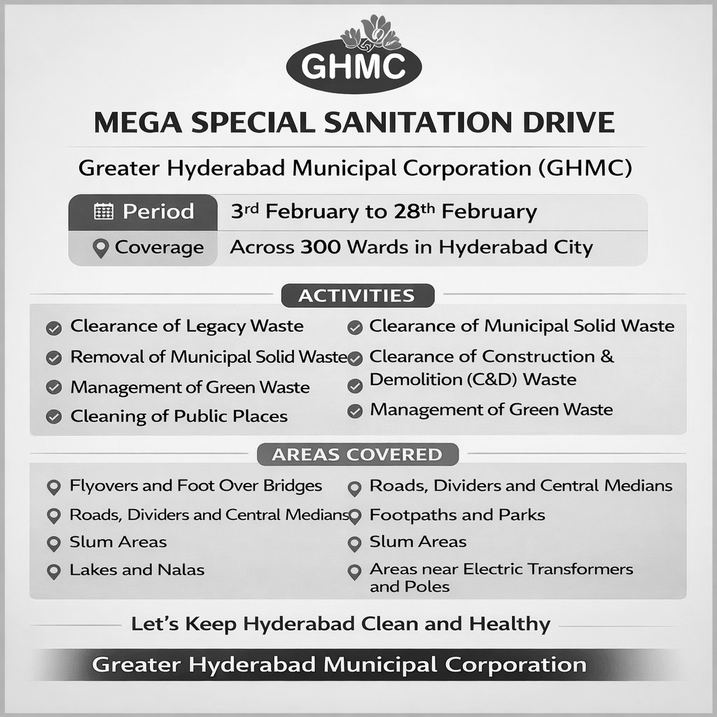 The Greater Hyderabad Municipal Corporation (GHMC) has launched a massive sanitation initiative aimed at providing residents with a cleaner and healthier environment. Officials announced that a “Special Sanitation Drive” will run across the city from February 3 to 28 , with daily sanitation activities across all 300 divisions.