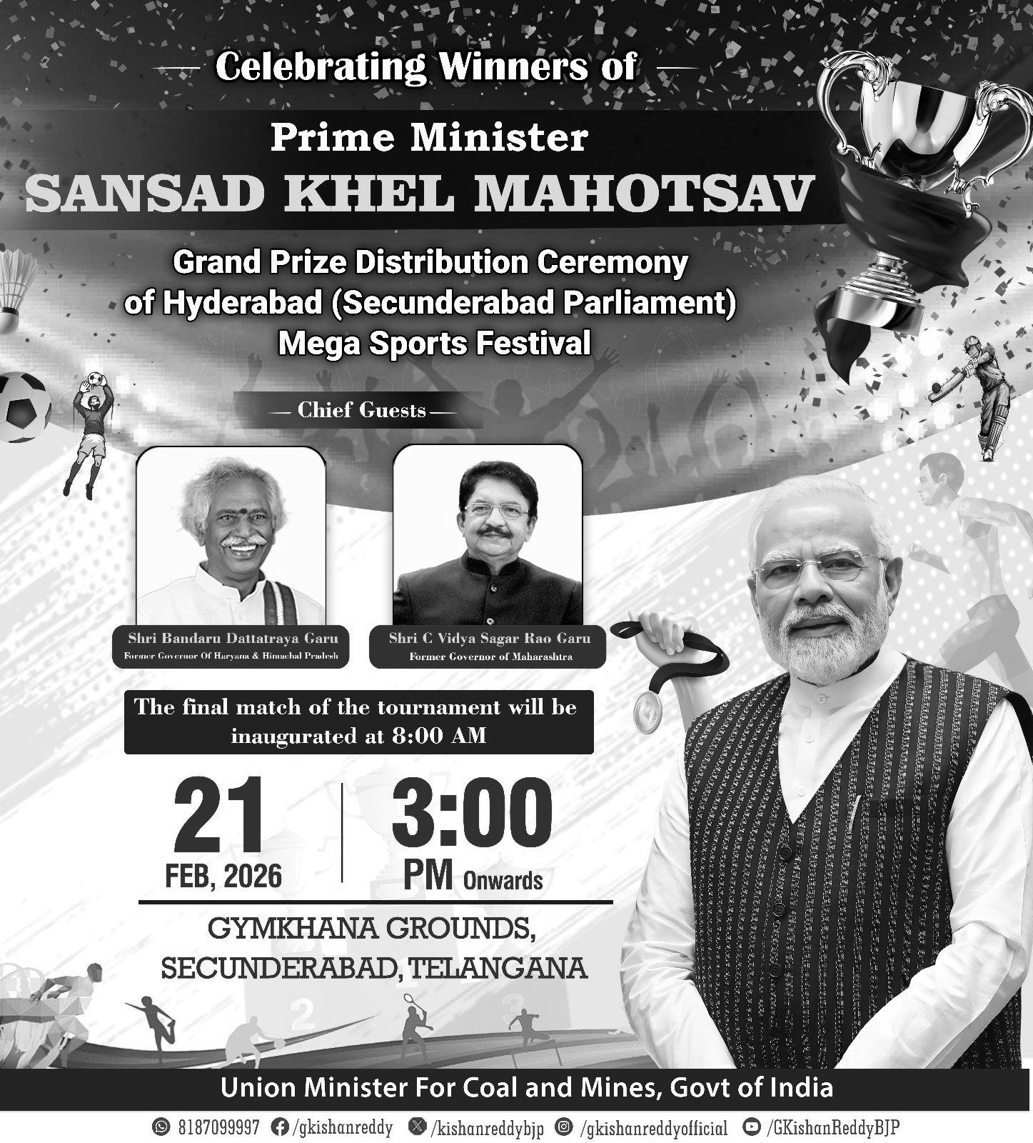 The Pradhan Mantri Sansad Khel Mahotsav , organised across the twin cities of Hyderabad and Secunderabad over the past month, will conclude today with a grand closing ceremony in Secunderabad. The mega grassroots sports festival witnessed enthusiastic participation from across the region, with competitions conducted at 39 venues and nearly 33,378 athletes showcasing their talent in multiple sporting disciplines.