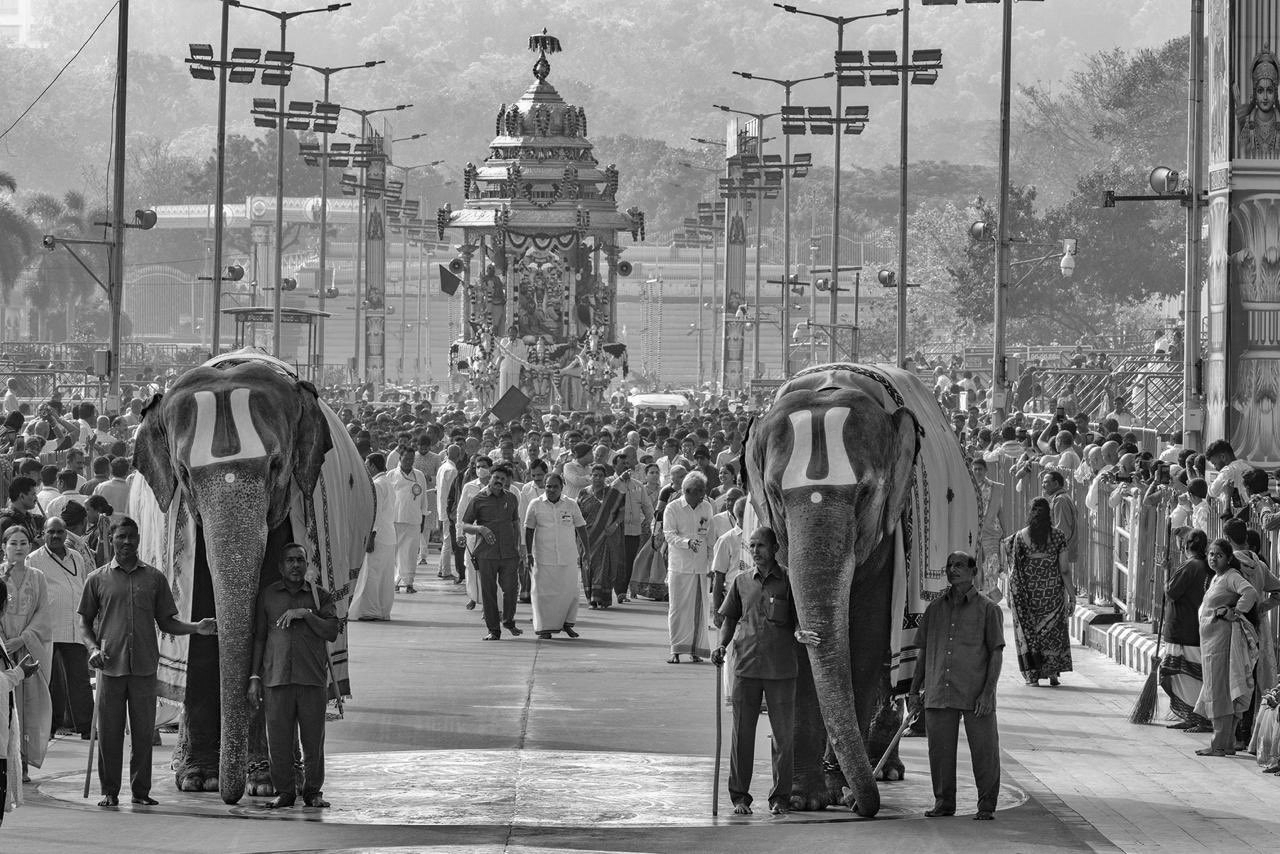 As part of the celebrations, the Swarna Rathotsavam held on the Mada streets of Tirumala mesmerized devotees. From 9 a.m. to 10:30 a.m. , Malayappa Swamy , along with Sridevi and Bhudevi , gave darshan on the golden chariot . The temple complex was adorned with nearly 60 tonnes of flowers and fruits , while a replica of the Sri Ranganatha Swamy Temple near the shrine emerged as a major attraction . For security, over 3,500 police and vigilance personnel were deployed.