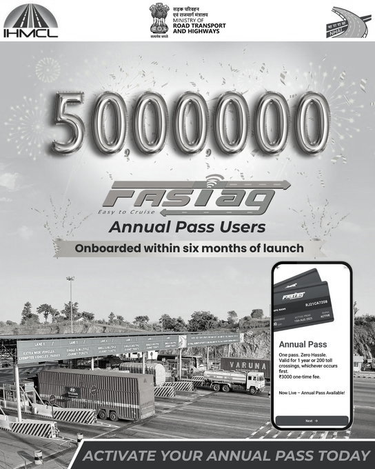 In a major boost to the government’s initiative of enhancing the ‘Ease of Commuting’, the FASTag Annual Pass has emerged as a widely accepted solution for seamless highway travel, crossing 50 lakh users within just six months of its launch. Introduced on August 15, 2025, the pass has facilitated over 26.55 crore toll transactions, reflecting its growing popularity among private vehicle owners across the country.